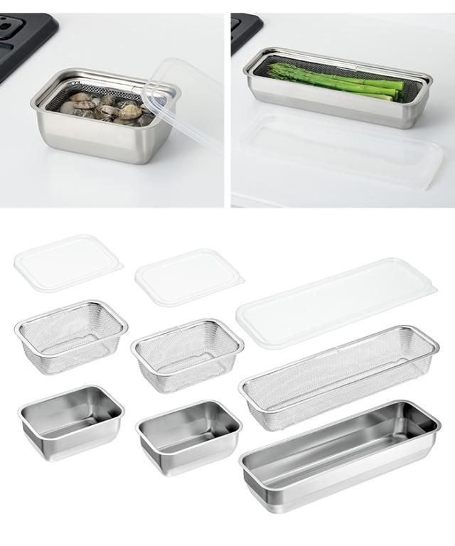 | バット:18-8ステンレス鋼(0.4mm厚) 蓋:ポリエチレン樹脂(耐熱60℃・耐冷-30℃) ザル:18-8ステンレス鋼 |