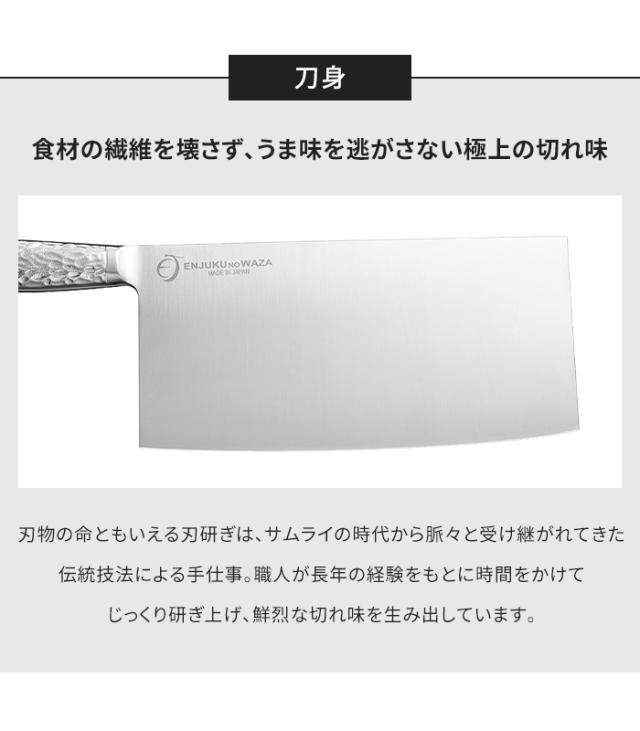 キーワード: 燕熟の技 中華包丁 220mm ステンレスハンドル 刃物職人 切れ味 食材のうま味保持 日本製 槌目模様 高級デザイン 握りやすい 軽量 高品質 万能包丁 料理包丁 ナイフ ステンレス包丁 刃物 調理用 料理用 キッチン用品 調理用品 全長35cm 便利 スタイリッシュ 槌目 キッチン 台所 家庭用 業務用