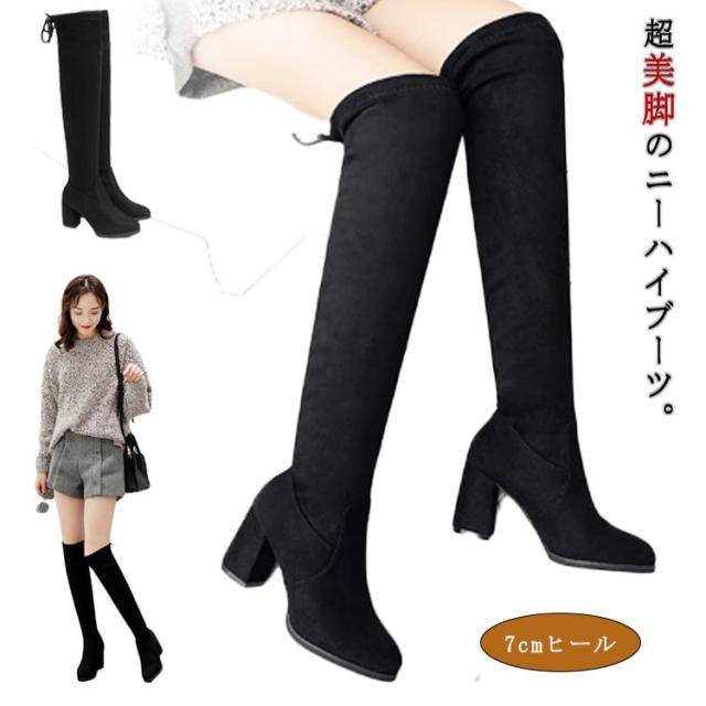ブーツ 7cmヒール ロングブーツ 美脚 細見え 歩きやすい ニーハイブーツ 太めヒール ロング丈 ニーハイ ストレッチ バイクブーツ 春 秋冬 ダンス コスプレ ハロウィン