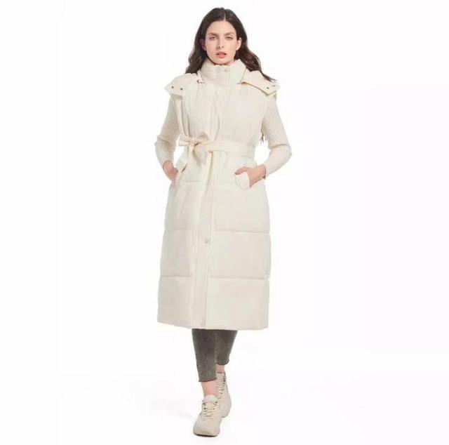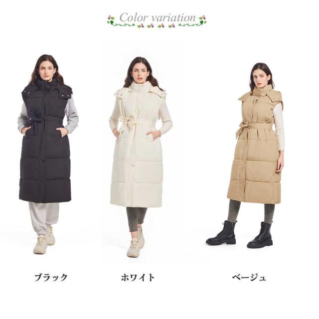 ロングベスト レディース ベスト ファイバーダウン コート ロング丈 膝下丈 フード付き ベルト付き エコダウンベスト 中綿ベスト ノースリーブ エコダウンコート 秋 冬 アウター ベンチコート オーバーサイズ 無地 あったか 防寒 大人 カジュアル 通学 通勤 【送無】