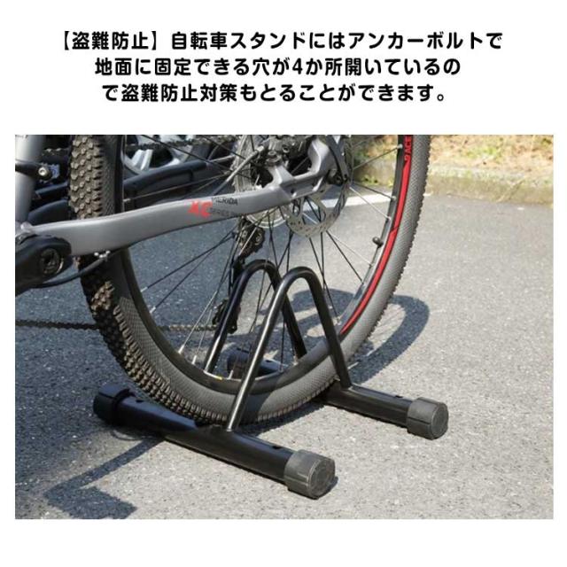 | ご家庭や店舗の駐輪スペースの整頓におすすめの自転車スタンドです。 【盗難防止】自転車スタンドにはアンカーボルトで地面に固定できる穴が4か所開いているので盗難防止対策もとることができます。 【転倒防止】強風が吹いても転倒する心配がなく、キックスタンドが付いていない自転車を安心して止めることができます。 【優れた耐久性】自転車スタンドの表面は粉体塗装仕上げで、錆びにくく、長期間ご使用いただけます。 【滑り止め】ゴム付きの足は滑りにくく、倒れにくく安定した駐輪ができます。 【前輪・後輪両対応】タイヤを差し込むだけで簡単に駐輪できるので、前輪からでも後輪からでも駐輪できます。 | |