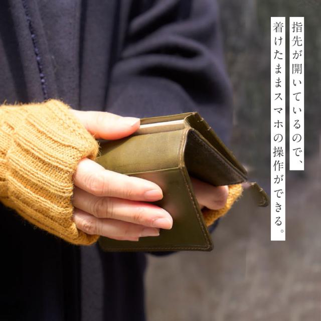 指先が開いているので、身に着けたまま様々なシーンで使え、屋外でのスマホの操作や、財布やバッグから物を取り出すとき、また、パソコン作業など寒い室内でのリモートワークにも大活躍。