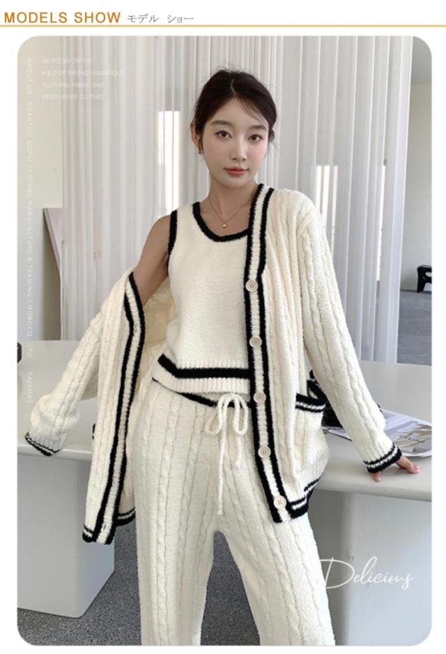モールニット ルームウェア ロングカーディガン 長ズボン キャミソール 3点セット ライン入り ケーブル模様 パジャマ ナイトウェア レディース 秋冬 リラックスウェア 部屋着 寝巻き 上下セット ルームウェア 無地 あったか 寝間着