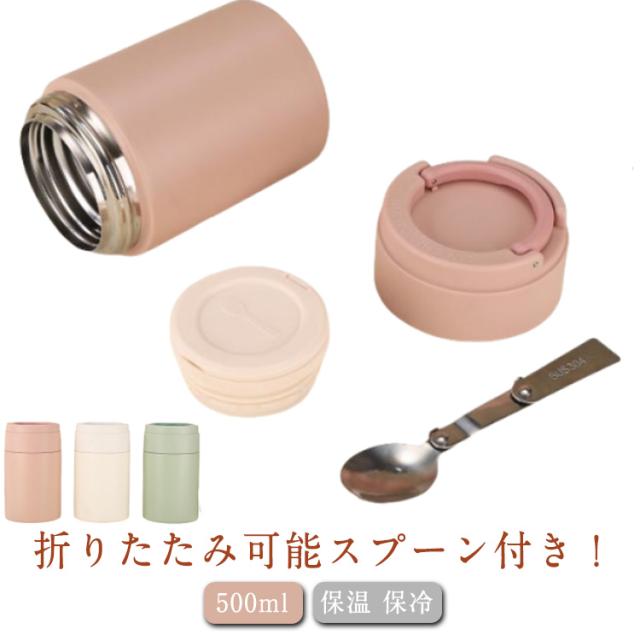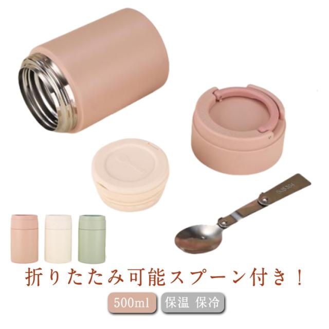 折りたたみスプーン付き スープボトル 500ml 持ち手付き 保温 二重真空断熱 お弁当 ランチジャー スープジャー 折りたたみスプーン付き 保冷 ステンレス 持ち運び ハンドル付き 通勤