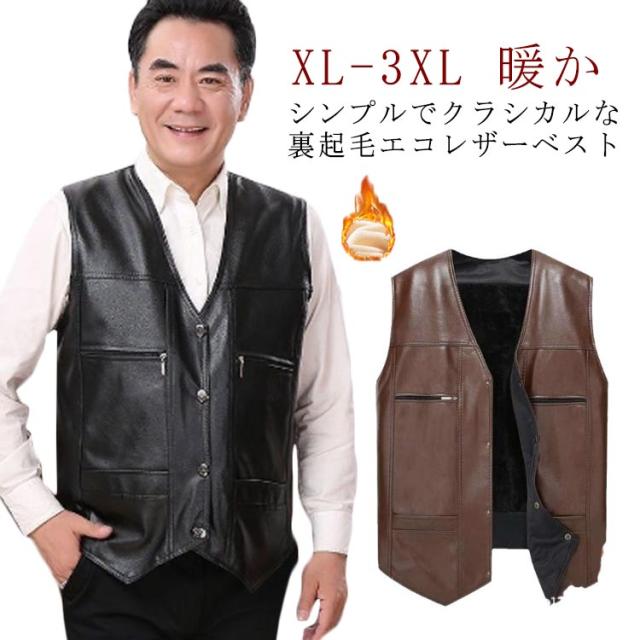 裏起毛 ポケットあり ベスト 前開き 父の日 合皮 フェイクレザー レザーベスト 防寒 裏ボア あったか カジュアル 紳士 男性 レザー 暖か 敬老の日 プレゼント ギフト 秋