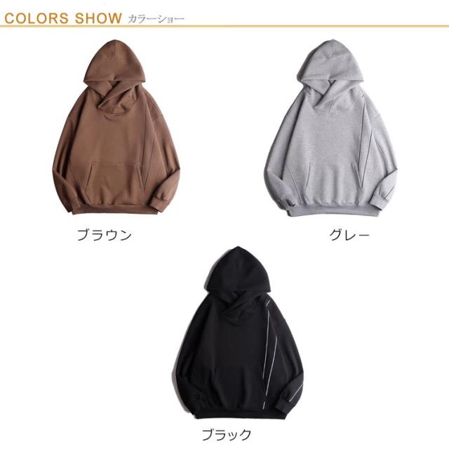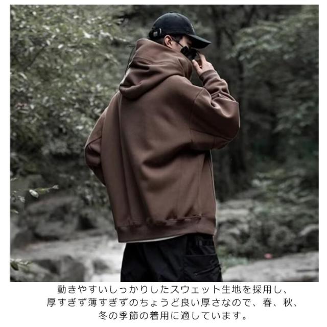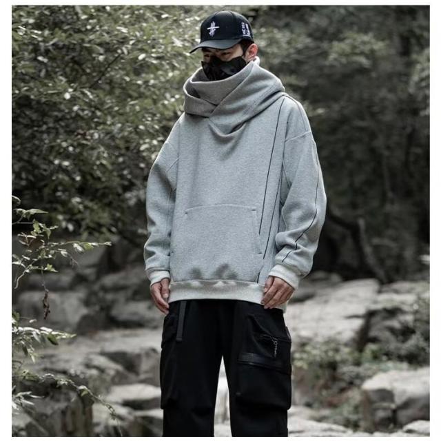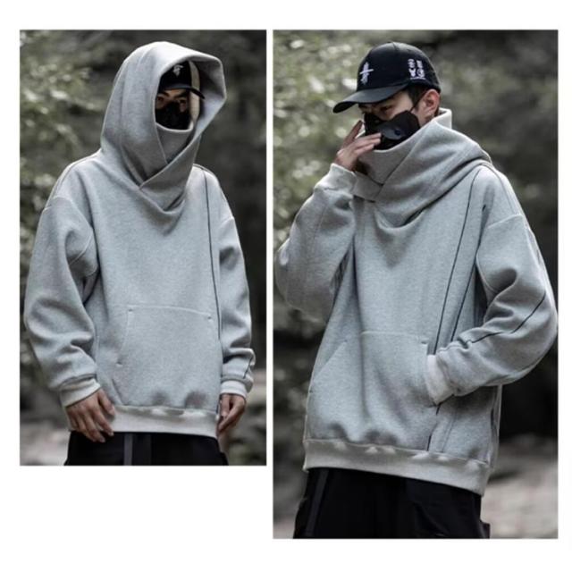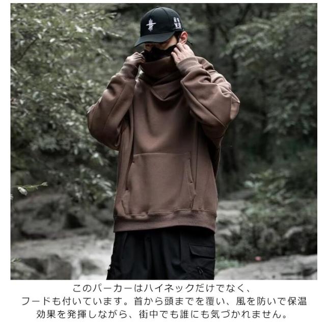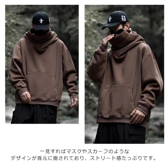 | 小顔効果・超ボリュームネックデザインのプルパーカー。 首元のデザインが今までに無い、斬新なデザインのフード付きパーカーが登場しました。 このパーカーはハイネックだけでなく、フードも付いています。首から頭までを覆い、風を防いで保温効果を発揮しながら、街中でも誰にも気づかれません。 一見すればマスクやスカーフのようなデザインが首元に施されており、ストリート感たっぷりです。 動きやすいしっかりしたスウェット生地を採用し、厚すぎず薄すぎずのちょうど良い厚さなので、春、秋、冬の季節の着用に適しています。 | |