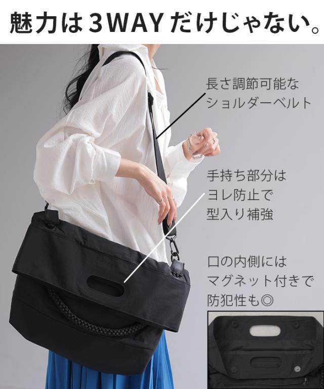バッグ ショルダー ハンド 3way レディース カバン 鞄 かばん 無地 肩掛け 大容量 収納 PC収納 パソコン 斜め掛け 通学 通勤 おしゃれ マチ 調節可能 ベルト ポケット インナーポケット 多機能 モード カジュアル 女性 黒 ブラック 秋 冬 HUG.U 秋新作
