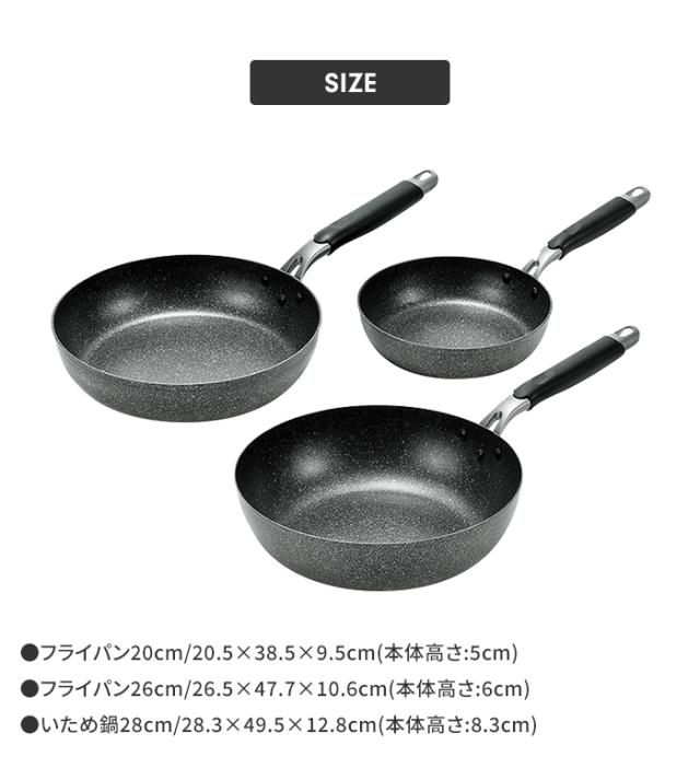 | [セット内容] ・フライパン20cm ・フライパン26cm(ガラス蓋付) ・いため鍋28cm |