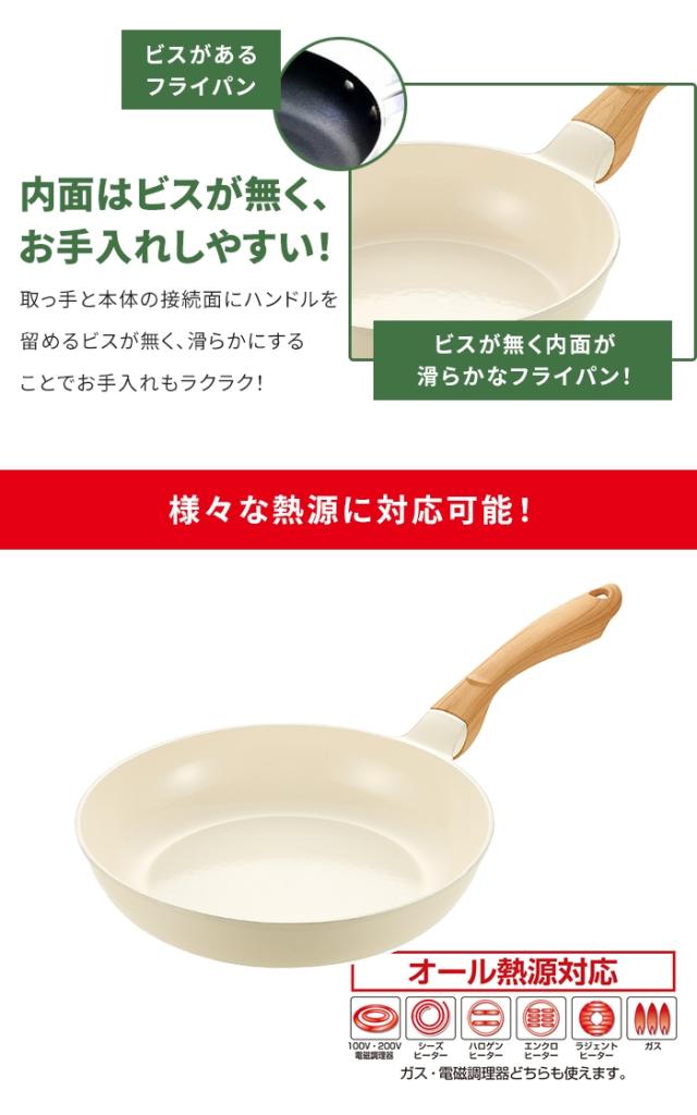 | 機能性とデザイン性を兼ね備えた調理器具シリーズ。 お料理が映えるアイボリーカラーと木目調のシックなハンドルがキッチンをおしゃれに演出。 セラミックコーティングにより、焦げ付きにくく、超軽量設計で扱いやすさも抜群。 熱周りが良いので、中火で十分に調理可能でフライパンも長持ち。 耐久性に優れ(金属ヘラOK)、内面にビスがないので、お手入れも簡単。 オール熱源対応で、200V電磁調理器にも対応可能。 |