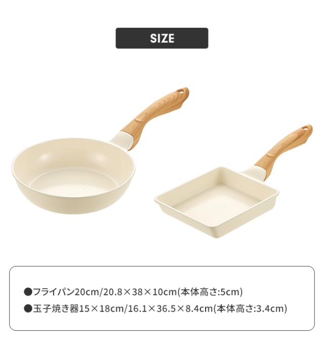 【値下げ】フライパンセット 2点 フライパン 20cm/卵焼き器 IH ガス火 セラミック 白 おしゃれ 木目調ハンドル ホワイト 金属ヘラOK 玉子焼き器 お弁当 セラミックコーティング 一体型 オール熱源対応 軽量 お手入れ簡単 新生活 一人暮らし