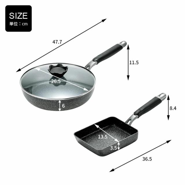 | [フライパン(蓋・ハンドル含む)]26.5×47.7×11.5cm(本体高さ:6cm)/(重量)1.37kg [玉子焼]13.5×36.5×8.4cm(本体高さ:3.5cm)/(重量)400g |