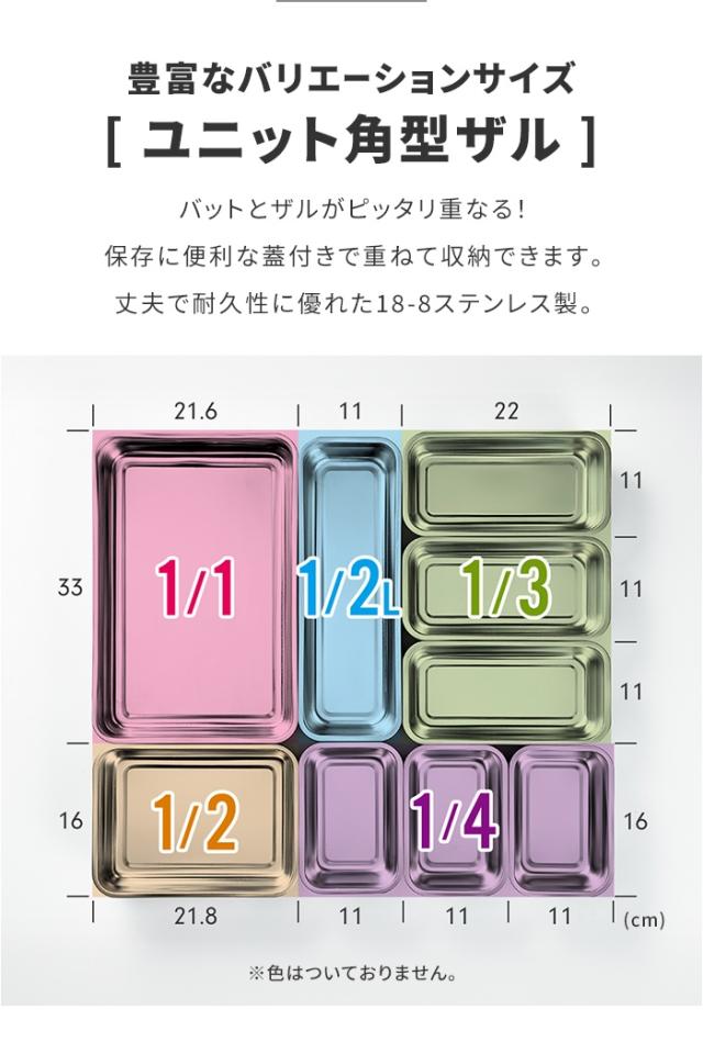 | 【ユニット角型バット】 ● バット(size:1/4)、フタセット ● バット(size:1/3)、フタセット ● バット(size:1/2)、フタセット ● バット(size:1/2L)、フタセット ● バット(size:1/1)、フタセット ● バット(size:1/3)、フタ×各2個 ● バット(size:1/2)、フタ×各2個 ● バット(size:1/2L)、フタ×各2個 ● バット(size:1/3)、フタ×各3個 【ユニットザル】 ● ザル(size:1/4) ● ザル(size:1/3) ● ザル(size:1/2) ● ザル(size:1/2L) ● ザル(size:1/1) ● ザル(size:1/4)×3個組 【ユニット角型バット&ザル】 ● バット(size:1/4)、ザル、フタセット ● バット(size:1/3)、ザル、フタセット ● バット(size:1/2)、ザル、フタセット ● バット(size:1/2L)、ザル、フタセット ● バット(size:1/1)、ザル、フタセット ● バット(size:1/3)、ザル、フタ×各2個 ● バット(size:1/2)、ザル、フタ×各2個 ● バット(size:1/4)、ザル、フタ×各3個 ● バット(size:1/3)、ザル、フタ×各3個 ● バット(size:1/2)、ザル、フタ×各3個 ● バット(size:1/2)、フタ&バット(size:1/1)、フタ&ザル(seize:1/2)セット ● バット(size:1/4)、ザル、フタ×各2個&バット(size:1/2L)ザル、フタセット ● バット(size:1/4)、ザル、フタ×各3組&バット(size:1/2)、ザル、フタセット ● バット(size:1/4)、ザル、フタ×各2組&バット(size:1/2L)、ザル、フタ&バット(size:1/1)、ザル、フタセット ※このページは[ユニット角型バット&ザル バット(size:1/1)、ザル、フタセット]を販売しております。 |