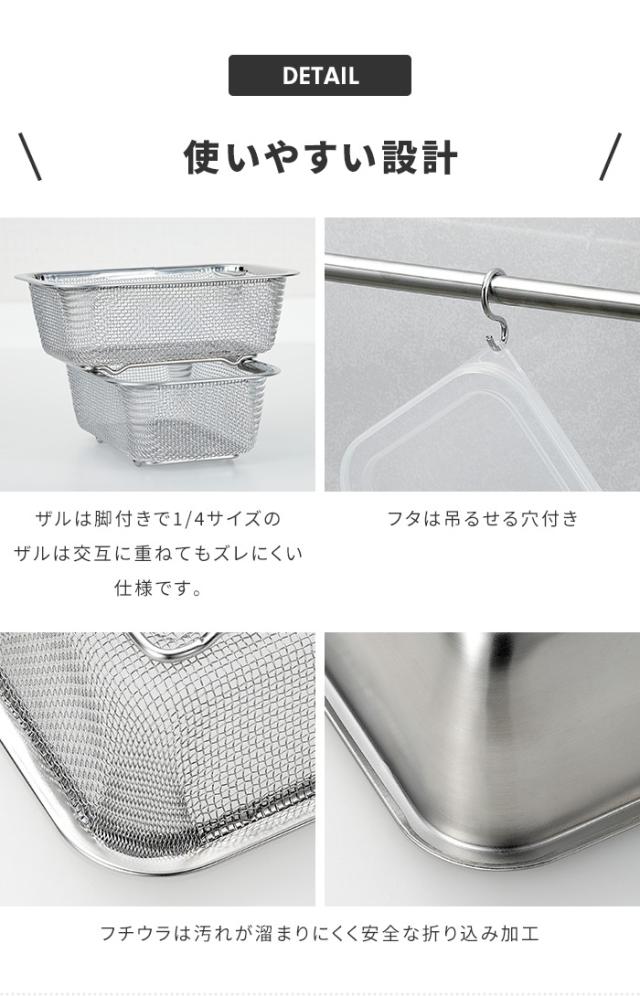 | ・丈夫で耐久性に優れたステンレス製 ・フチ裏は汚れがたまりにくく安全な折り込み加工 ・保存に便利な蓋付で重ねて収納できます ・蓋は吊るせる穴付き ・冷蔵、冷凍保存OK ・バットとザルがピッタリ重なります |