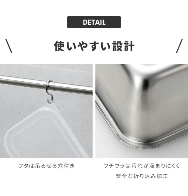 | ・丈夫で耐久性に優れたステンレス製 ・フチ裏は汚れがたまりにくく安全な折り込み加工 ・保存に便利な蓋付で重ねて収納できます ・蓋は吊るせる穴付き ・冷蔵、冷凍保存OK |
