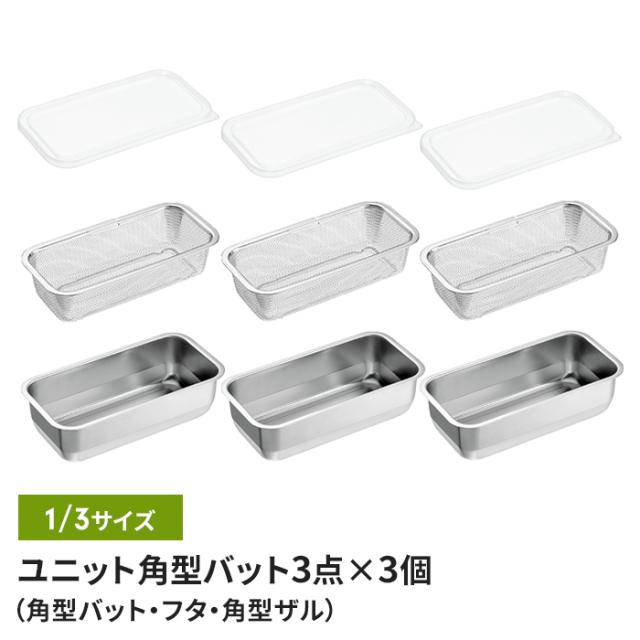 【値下げ】バット/フタ/角ザル 1/3サイズ ザル・バット3点×3個組セット 燕三条 角型 キッチンバット 蓋付き バット ステンレスバット ステンレスザル ざる 水切りザル 日本製 ステンレス製 ザル 下ごしらえ 水切り 下処理 スタッキング 新生活 一人暮らし