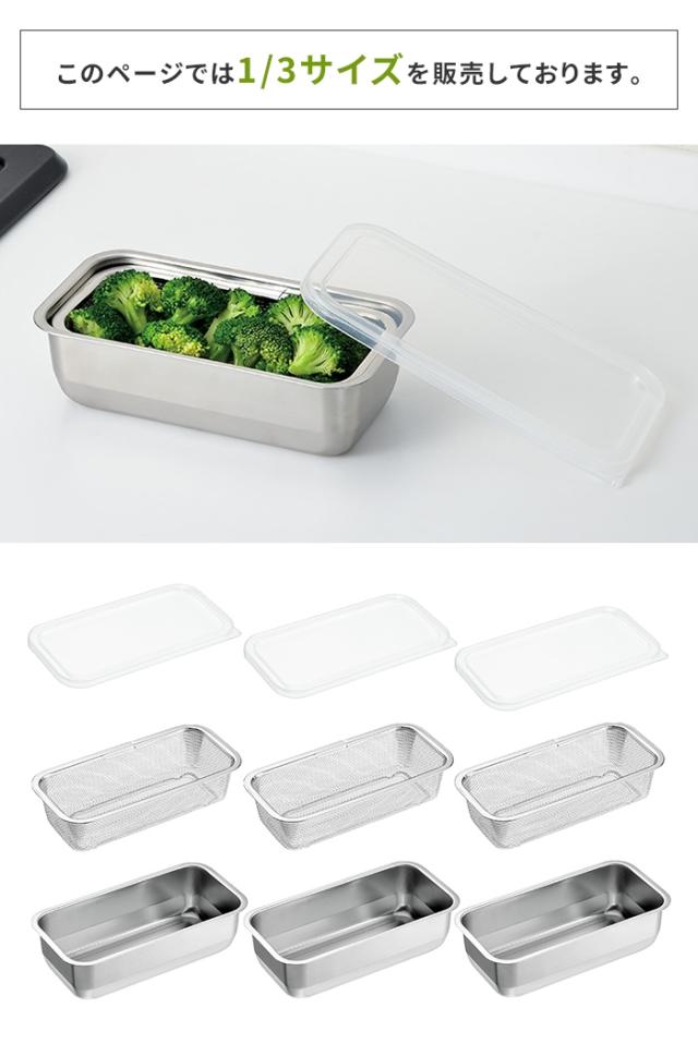 | [バット1/3](外径)22×11×高さ6cm (内径)20.6×9.8cm/(重量)150g/(容量)1L [ザル1/3]20.4×9.6×高さ5cm/(重量)90g [蓋]50g |