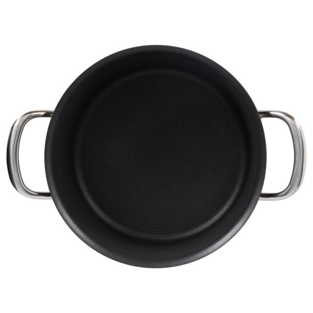 食材がするりと滑る、感動もののサーキュロンエクセレンスシリーズ。内面は渦巻き状に凹凸加工が施されており、ノンスティックの表面積を広げ、食材の接地面積を少なくすることで食材のこびり付きにくさを実現。ボディは軽くて熱伝導のよいアルミニウムに、硬質アルマイト加工を施すことで表面硬度をアップ。軽さと丈夫さを兼ね備えた製品です。