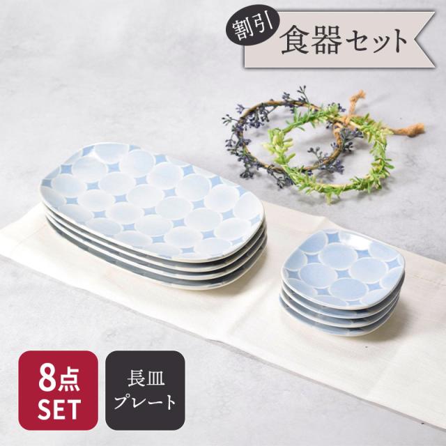長皿 19cm & プレート 9cm 4人用 8点セット 2種×各4点 アクア・セル 丸角型 割引セット 送料無料 和食器 おしゃれ 和モダン シンプル シック プレート 魚皿 長皿 皿 食器セット セット食器 ファミリー食器 家族食器 引っ越し 新生活
