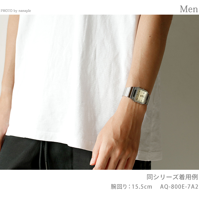7年保証キャンペーン カシオ CASIO クラシック クォーツ 電池式 クォーツ 電池式 ユニセックス 腕時計 AQ-800EG-9ADF CLASSIC アナデジ ゴールド ◆1980年代発売のAQ-450をモチーフにし、レトロとスタイリッシュが融合したモデルです。文字板と液晶が独立したデザインで、アナログの美しさとデジタルの機能性を両立。アナログ文字板はシンプルなバーインデックスと時分針で構成。盤面に格子柄をあしらい、レトロな雰囲気に仕上げました。ケース液晶部はトップ面を傾斜させたスタイリッシュな形状に仕上げています。また角型フォルムのケースと横長の駒形状を採用したメタルバンドを組み合わせることで、面構成が際立つスタイリッシュな外観に。ストップウオッチ、アラーム、デュアルタイム等、日常生活に便利な機能も備えています。オンオフ問わずコーディネートに合わせやすい時計です。 国内モデル品番:AQ-800EG-9AJF