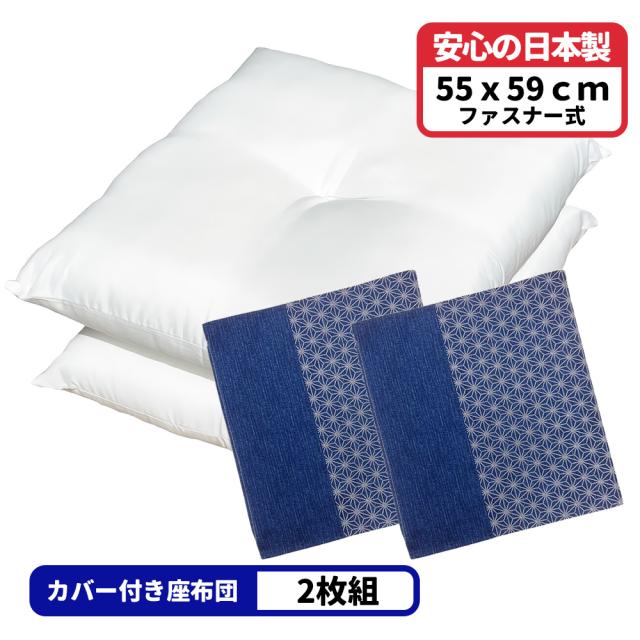 2枚 ヌード座布団 + 座布団カバー 55x59 しじら麻 セット 約55×59cm ブルー 送料無料 日本製 銘仙判 2枚組 2枚セット