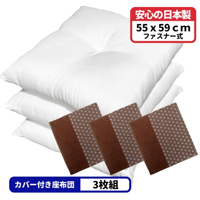 3枚 ヌード座布団 + 座布団カバー 55x59 しじら麻 セット 約55×59cm ブラウン 送料無料 日本製 銘仙判 3枚組 3枚セット