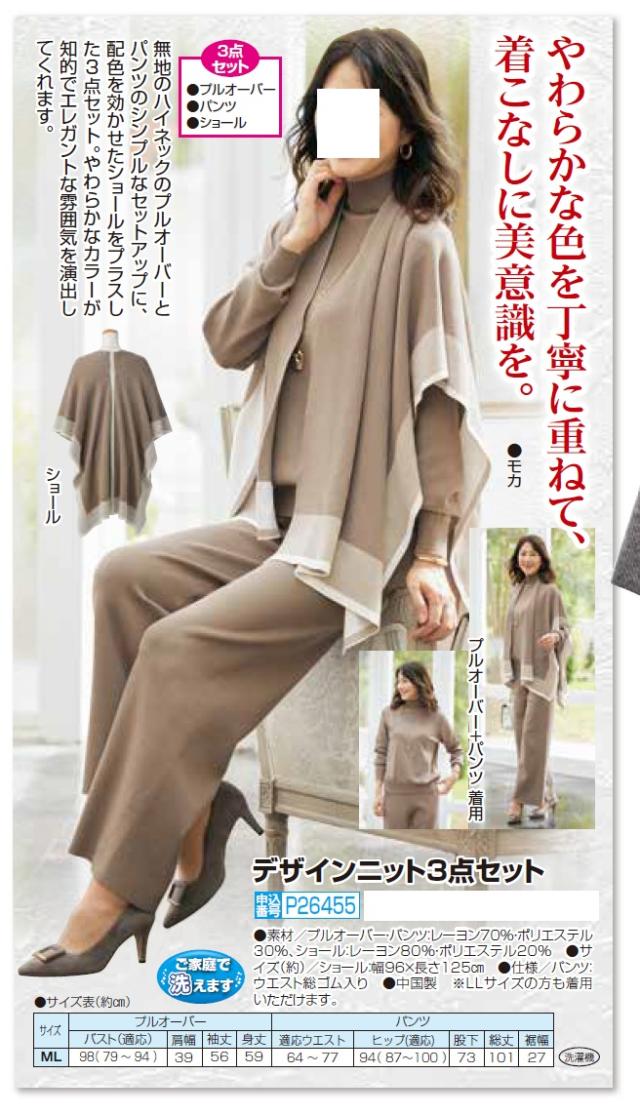 セットアップ デザインニット3点セット モカベージュ ハイネックカットソー パンツ ショール レディース 婦人服 ミセス シニア 女性 上品 大人かわいい シンプル 無地 シニアファッション 40代 50代 60代 70代 80代 母の日 お母さん おばあちゃん 秋冬 nss p26455