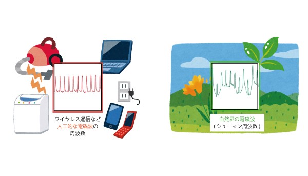 しかし、数十年前から、wifiやラジオ波、電子レンジ、携帯電話、飛行機などの開発により、 人工的につくられた電磁波が地球に出てくるようになりました。この人工的な電磁波は、正確であり規則正しく一定です。