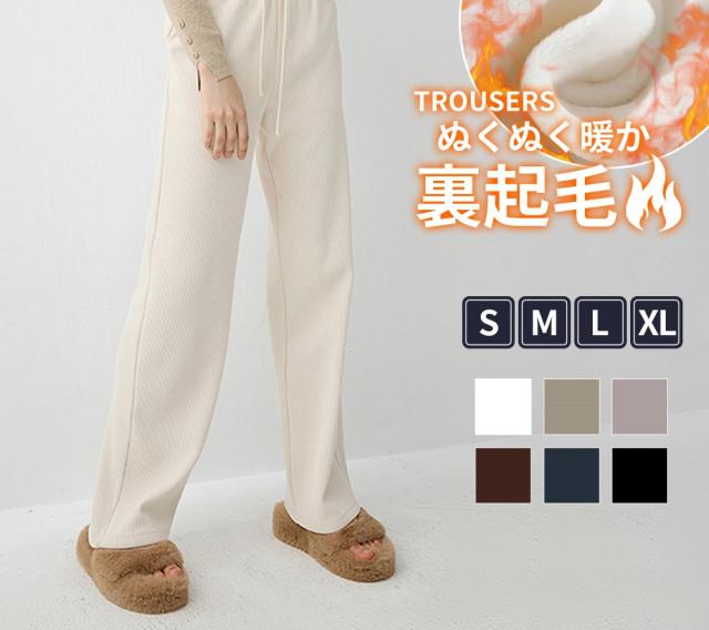 ワイドパンツ 裏起毛 ロングパンツ 秋冬 リブニットパンツ 美脚効果 ハイウエスト ゆったりロングボトムス