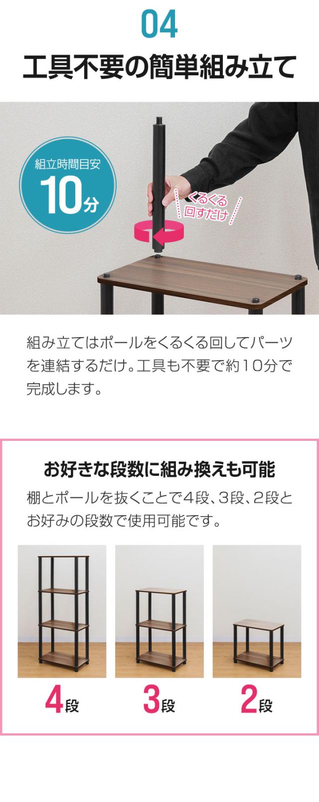 - こういうラックを探していて、いいもの見つけました。 お値段も高くないし、何より組み立てが簡単ですごく楽でした。置きたい場所にピッタリでとても気にいってます。 ありがとうございました。