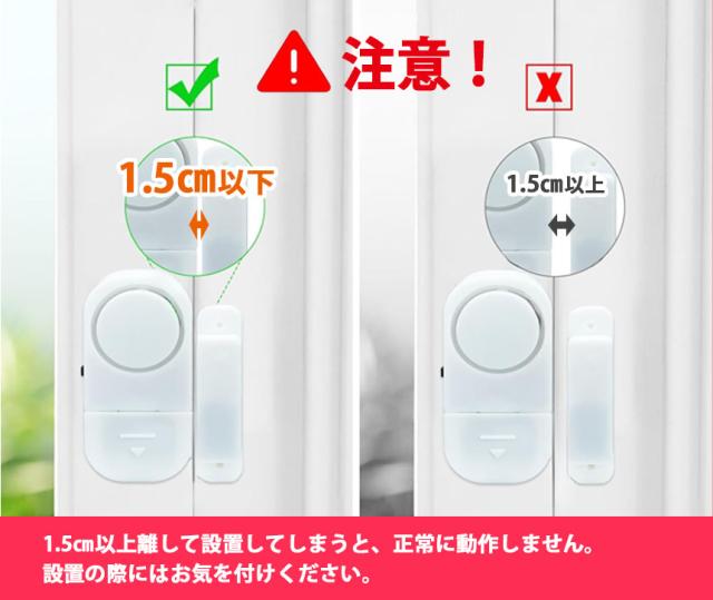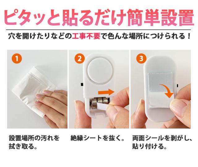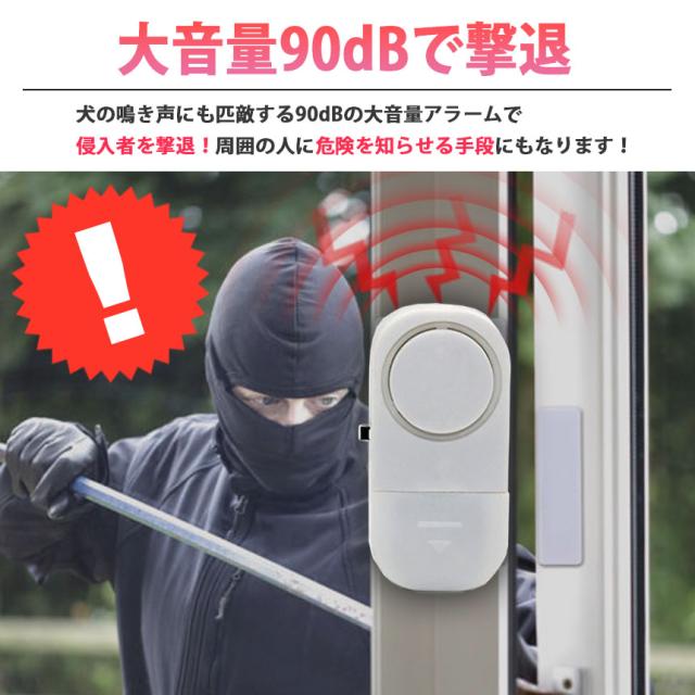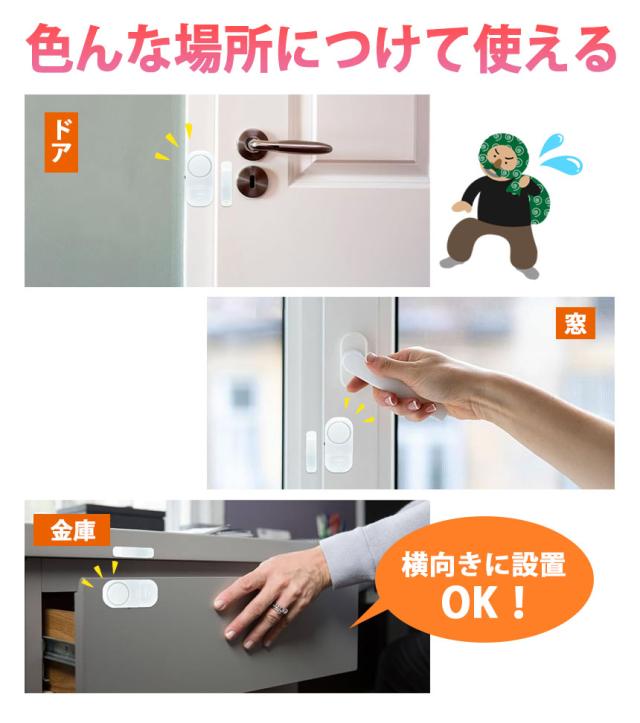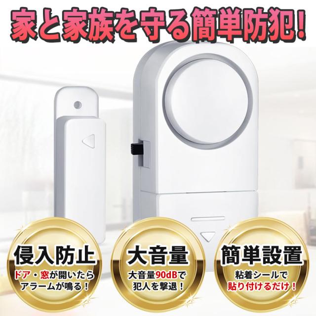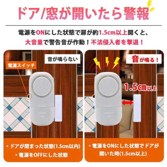 ●ドア・窓を開けると音が鳴る!●おうちへの不法侵入を防止する最強防犯グッズ!電源をONにした状態でドアや窓が1.5cm以上開くと大音量で警告音が鳴ります。外出時や睡眠中の防犯対策やお子様が勝手に出て行かないように守る用途でも使えます。ドアや窓以外にも、引き出しや押し入れ、たんすなど様々な場所に取り付けることができます。