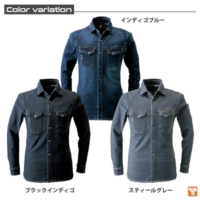 アイズフロンティア ストレッチ デニム 長袖シャツ 春夏 秋冬 作業服 作業着 ワークウェア メンズ レディース カジュアル かっこいい おしゃれ 大きいサイズ M L LL 3L 4L I'Z FRONTIER if-7251