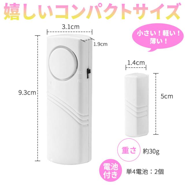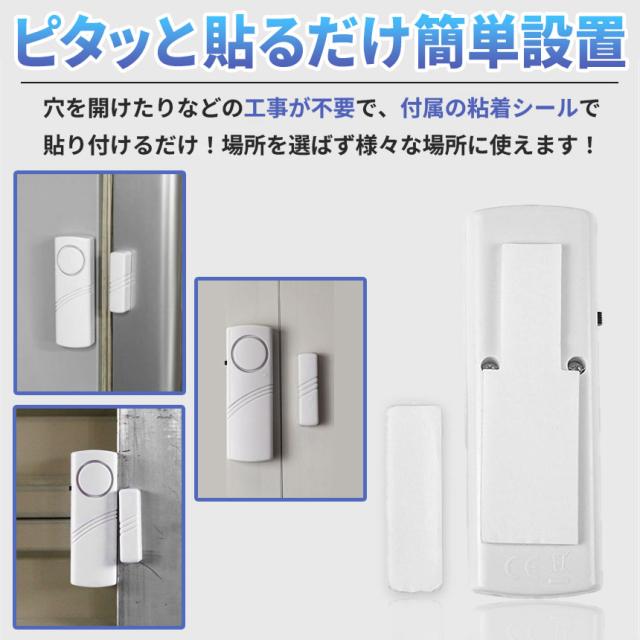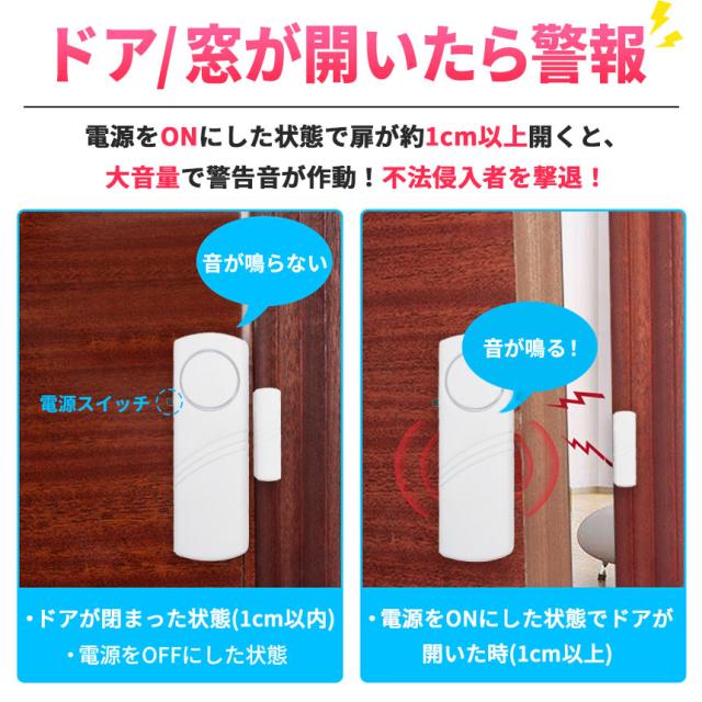 ●ドア・窓を開けると音が鳴る!●おうちへの不法侵入を防止する最強防犯グッズ!電源をONにした状態でドアや窓が1cm以上開くと大音量で警告音が鳴ります。外出時や睡眠中の防犯対策やお子様が勝手に出て行かないように守る用途でも使えます。ドアや窓以外にも、引き出しや押し入れ、たんすなど様々な場所に取り付けることができます。