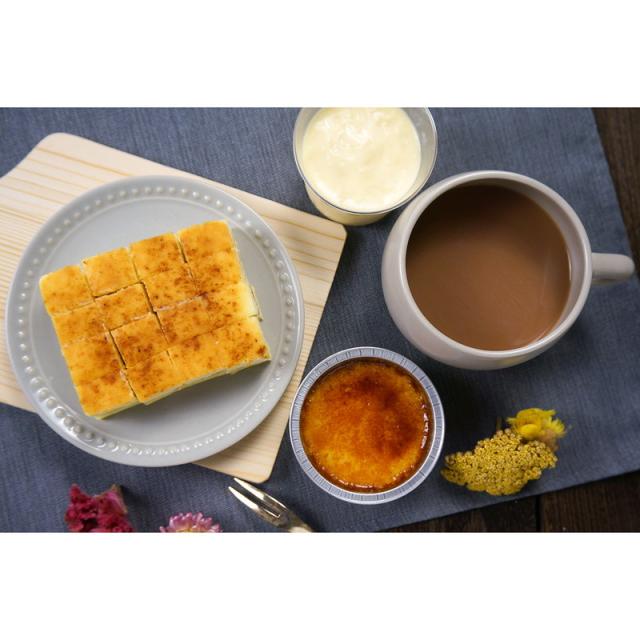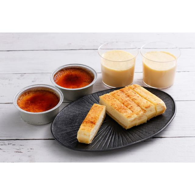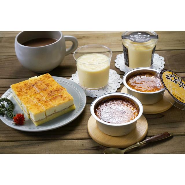北海道産の牛乳を使用した「乳蔵北海道プリン」と北海道産生クリームとクリームチーズを使用したプリンの表面をキャラメライズした「乳蔵あいすプリン」、クリームチーズを使用したプリンケーキの表面をキャラメライズした「焼きプリンケーキ」のセットです。