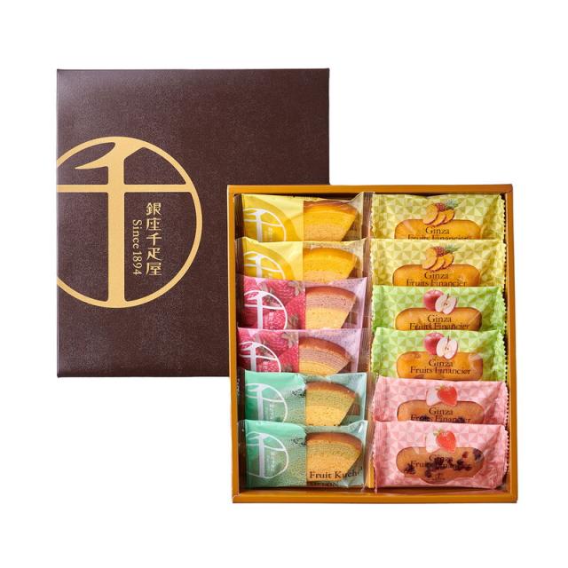 内容:銀座フルーツクーヘン(メロン&ミルク、イチゴ&ミルク、レモン&はちみつ)3種各2個、銀座フルーツフィナンシェ(パイナップル、ストロベリー、アップル)3種各2個