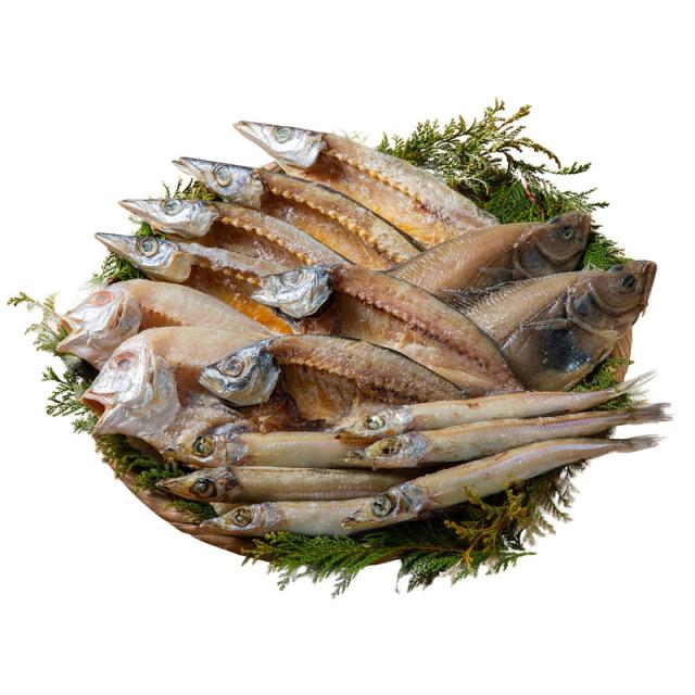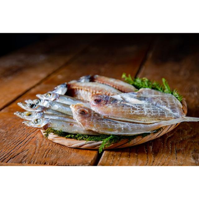内容:れんこ鯛開き(2尾)200g・沖きす丸干し丸干し(4〜6尾)200g・あじ開き(2尾)180g・えてかれい(2尾)160g×各1、かます開き(2尾)160g×2