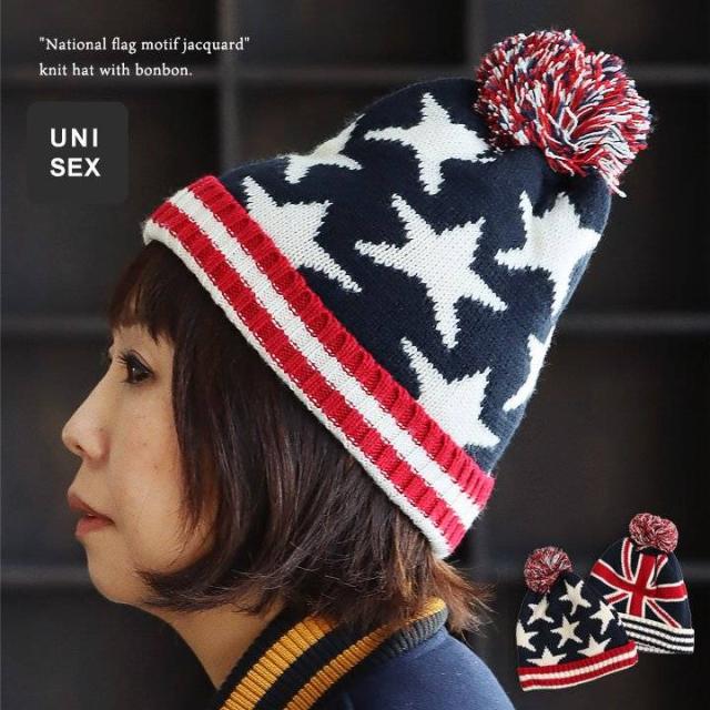 【メール便50】 ニット帽 帽子 レディース メンズ 国旗 星条旗 ユニオンジャック ニット アクリル100 ポンポン付き 伸縮性 暖かい 保温性 防寒 お出かけ 秋 冬 カジュアル パティ