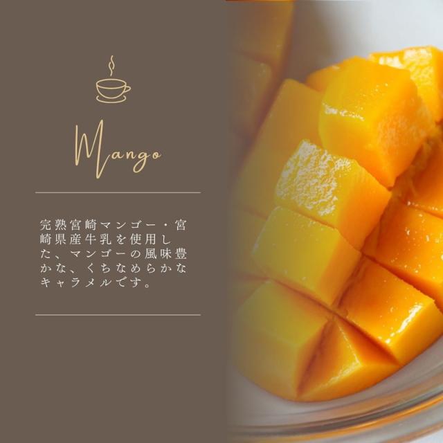 【完熟宮崎マンゴー】完熟宮崎マンゴー・宮崎県産牛乳を使用した、マンゴーの風味豊かな、くちなめらかなキャラメルです。