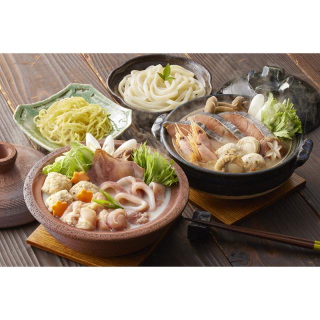 北海道産の秋鮭、帆立や、他にも海老、つみれなどを、味噌仕立てのたれでいただく北海道の郷土料理「石狩鍋」の具材と、北海道産の鶏もも肉や、真いか、他にもつみれなどを鶏の旨味たっぷりの白湯仕立てのたれでいただく鶏白湯鍋の具材を、それぞれ1〜2人前の少量タイプにセットしました。