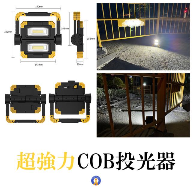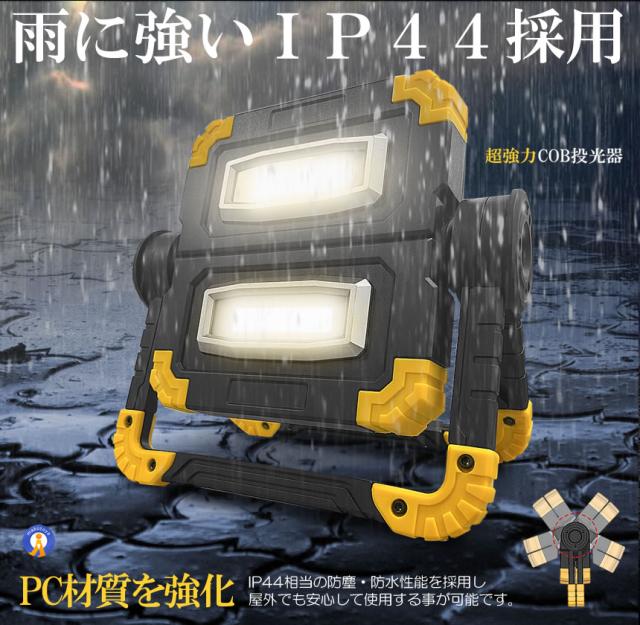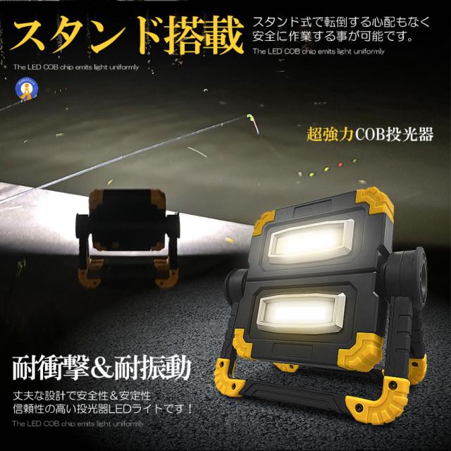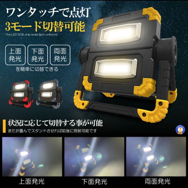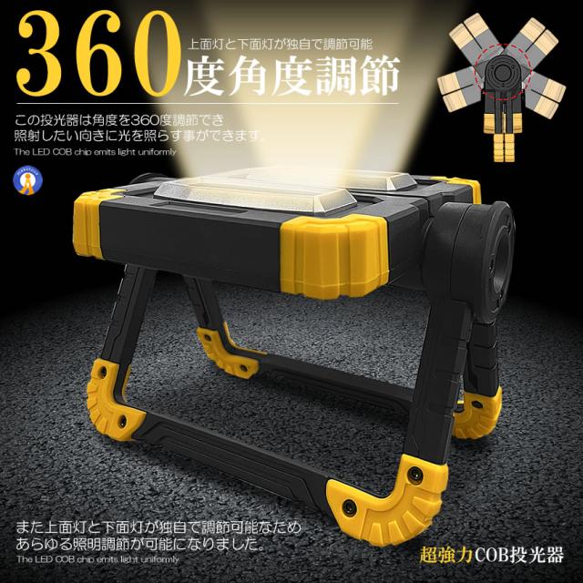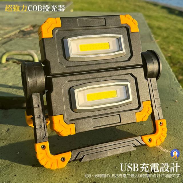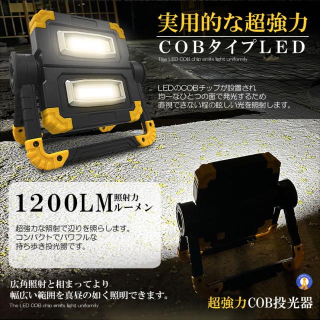 ●実用的な強力COBタイプLEDLEDのCOBチップが設置され均一なひとつの面で発光するため直視できない程の眩しい光を照射します。●1200ルーメン超強力な照射で辺りを照らします。コンパクトでパワフルな持ち歩き投光器です。●360度角度調節できる●ワンタッチで点灯3モード切替可能です。●折り畳み式でコンパクト&小型●フック持ち手付き●スタンド搭載●耐衝撃&耐振動●USB充電設計送料無料