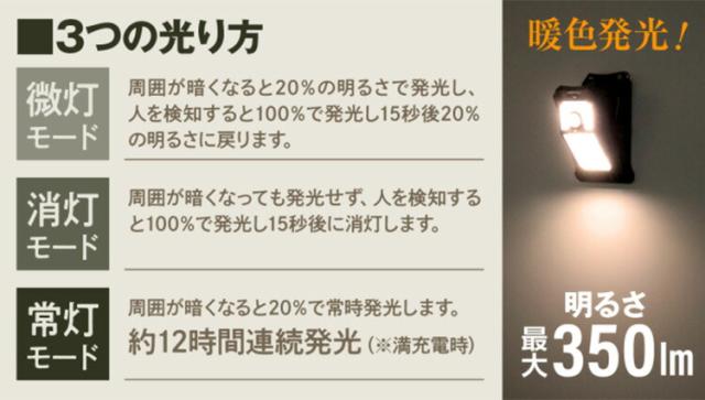 ・微灯モード:周囲が暗くなると20%の明るさで発光し、人を検知すると100%で発光し15秒後20%の明るさに戻ります。 ・消灯モード:周囲が暗くなっても発光せず、人を検知すると100%で発光し15秒後に消灯します。 ・常灯モード:周囲が暗くなると20%で常時発光します。(※センサーは作動しません。)最長約12時間連続発光(※満充電時) |