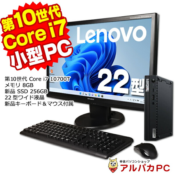 デスクトップパソコン 中古 Windows11 超小型 軽量 Lenovo ThinkCentre M70q Tiny 22型ワイド液晶セット 第10世代 Core i7 10700T メモリ8GB 新品SSD256GB Windows11 Pro デスクトップパソコン Office付き