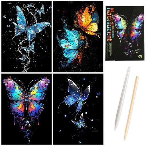 METBOU スクラッチアート 大人 蝶々 4枚セット 夜光 スクラッチ アート スクラッチペーパー 簡単 削るだけで スクラッチアートペン付き DIY 部屋飾り プレゼント インテリア 絵