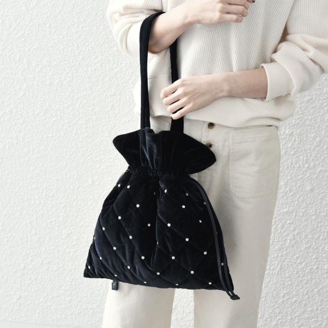 ラインストーンを表地にあしらった、巾着型のトートバッグ。