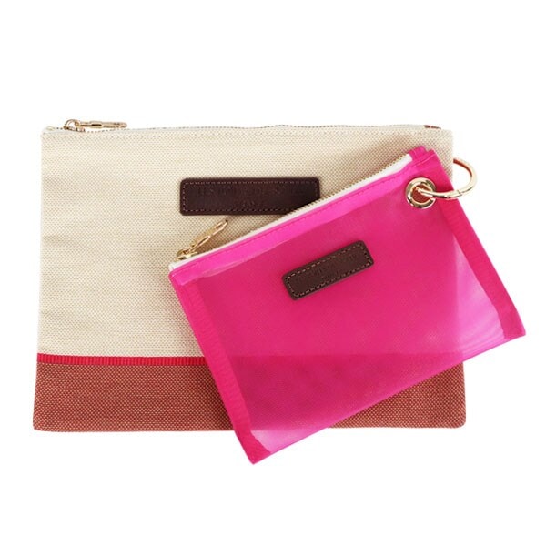 ソレイユストライプのポーチと、メッシュ素材のミニポーチのペアセット。