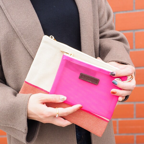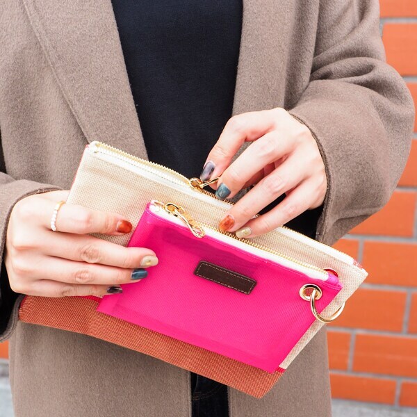 カラビナでジョイントされたポーチはバッグの中で重宝します。