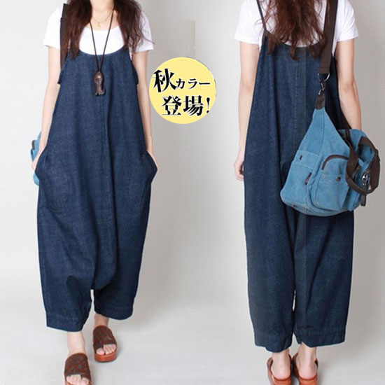 【本日の激短SALE】サロペット レディース デニム 春秋 オーバーオール サルエルパンツ 大きいサイズ シンプル ロング丈 ストレッチ ゆったり 着痩せ 調節可能