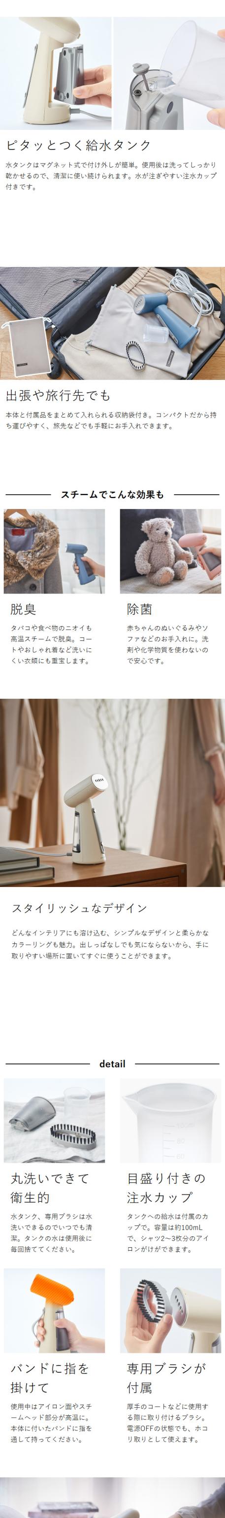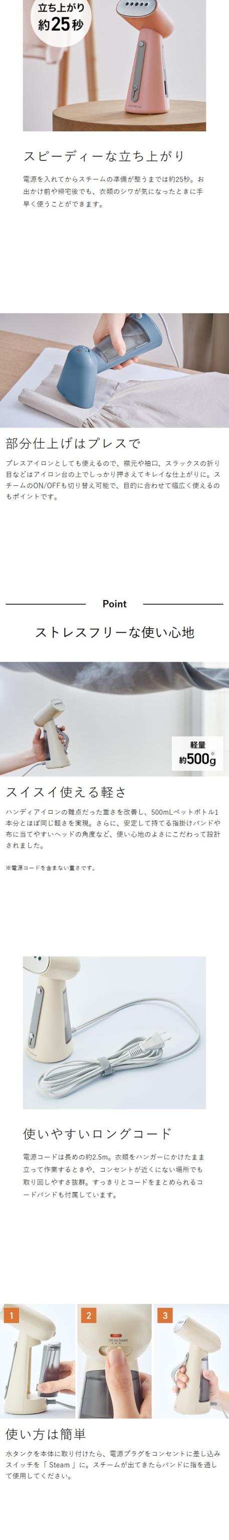 軽さと使いやすさにこだわって設計された衣類スチーマー。立ち上がりは約25秒、使いたいときにサッとお手入れできます。高温のスチームで脱臭や除菌などにも活躍。アイロン台でも使用OK。