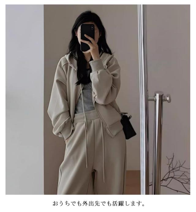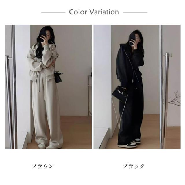 | ジップアップパーカーとロング丈ワイドパンツの上下セット。 おうちでも外出先でも活躍します。 程度良い厚みあるしっかりとした生地感で秋から春まで使えます。 セットアップそのままではもちろん、単品それぞれもコーディしやすい。 ワイドなロング丈パンツでリラックスしても脚長効果の期待できます。 | |