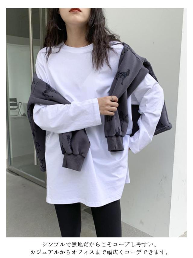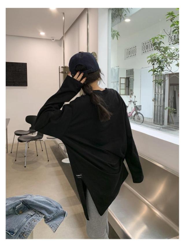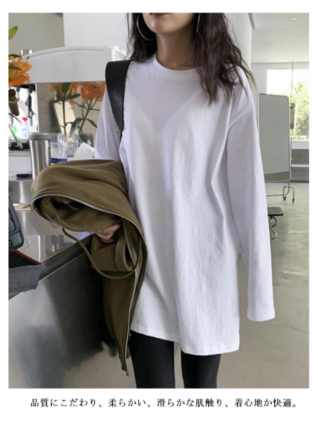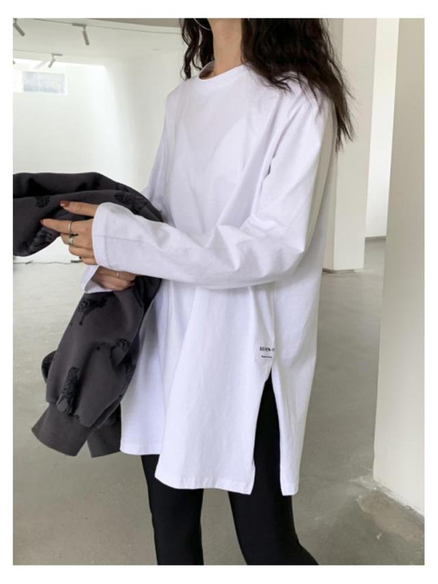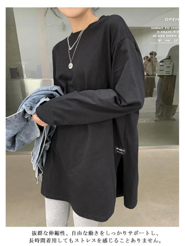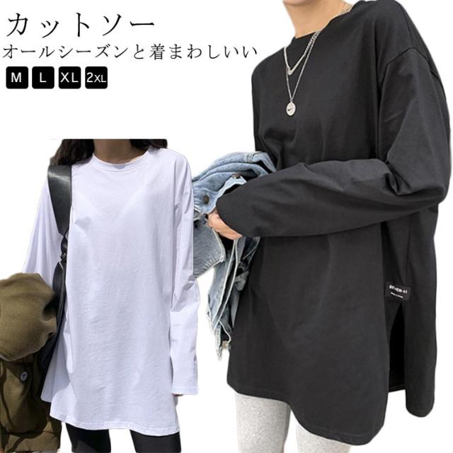 Tシャツ 長袖 カットソー レディース トップス ロングTシャツ ラウンドネック ゆるTシャツ ロンT 長袖Tシャツ 長そで ドロップショルダー クルーネック カットソー インナー スリット 着痩せ ゆったり 重ね着 秋 冬 丸首 無地 カジュアル シンプル 白 黒