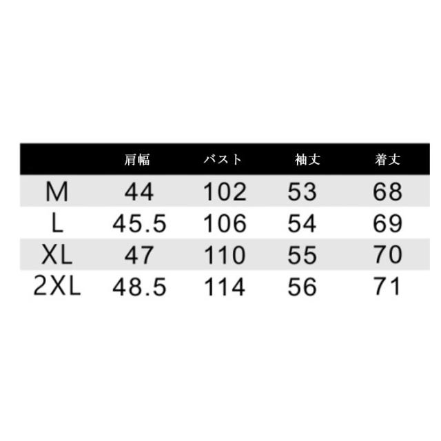 | サイズについての説明 | M L XL 2XL サイズ:写真通り ※上記サイズは平置き実寸になります。サイズ表の実寸法は商品によって1-3cm程度の誤差がある場合がございます。 |